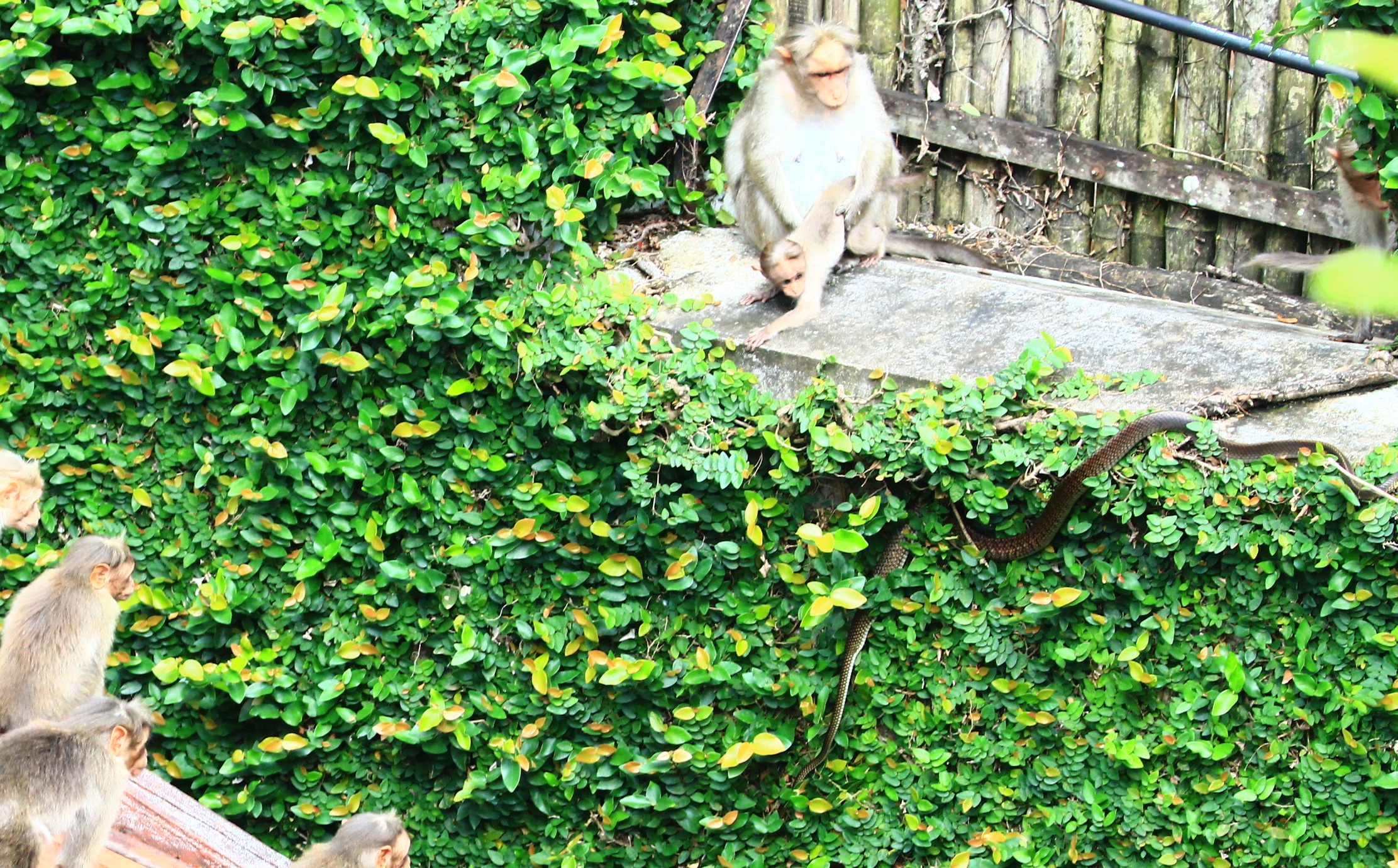 Did you see the dark ribbon (or it may look to you like a leather belt, if you read Seth’s post on a similar topic)? I really did not know it was there when I was taking the photos or when I was going through all my pictures. Just like a treasure hunter, I went back to my Picture folders and start digging for a more clear picture and I found some that included clear views of a snake. As I look back at these pictures, I realize that the Macaques are in fact looking at it. How had I missed the highlight of the scene?