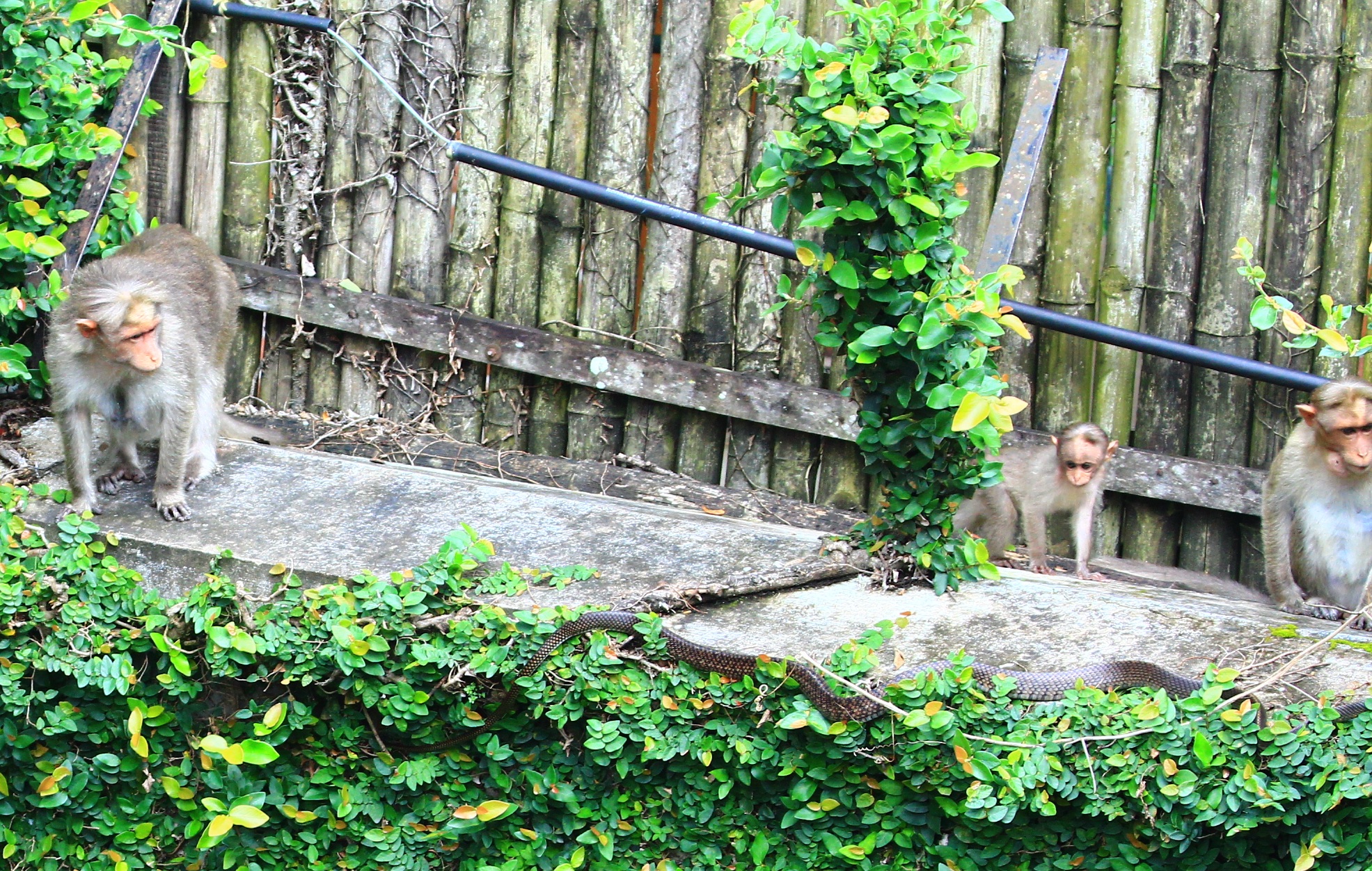 There are some things school cannot teach (Snake-Spotting 101). Maybe this is the value of on the job training, what an internship is all about. After spotting this, and having a good laugh over the photographer (me) not having seen it, the next question on everyone’s mind was: should we be worried? Thankfully, the answer is no. The incidence of snake-induced injury here in Thekkady or even within the Periyar Reserve among tourists is zero. Whew! As thrilling as this spotting was (for the monkeys too, presumably), the snake pictured here was a common rat snake. Not the slightest danger…