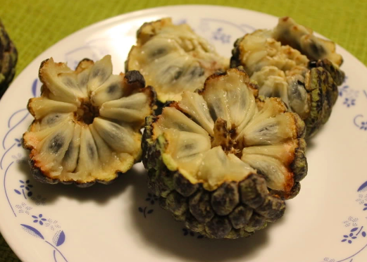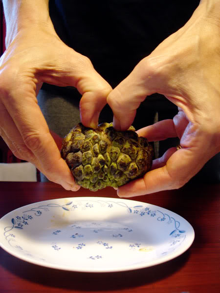 Finding it and eating it would be a prize indeed! It opens easily when ripe with a mere pressure of the fingers required to separate the sides, which open to expose clusters of milky white segments. Each segment contains a shiny black seed that wouldn’t be amiss dried, pierced and strung as jewelry. The flesh is sweet and custardy (hence the name), with somewhat of a perfumed quality that we all enjoyed.