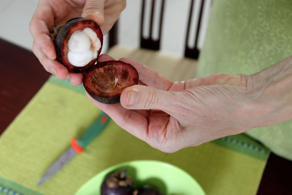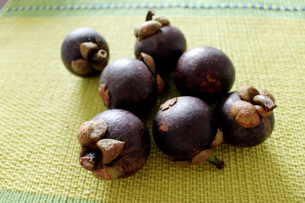 Mangosteens are native to the Moluccas Islands of Indonesia and it is believed they were brought to southern India in the late 17th century. It’s ironic that the more popular name for Moluccas are the Spice Islands, considering that the tree now grows in what is known as India’s spice coast. Another interesting fact is that it is sometimes called the “Queen of Fruits”. I don’t know if this sobriquet bares any relationship to the mango’s “King of Fruits”, but I plan to do some poking around to find out. (Actually, one has to be careful with anthropomorphizing fruits in this manner, as the Durian apparently also carries the royal masculine moniker as well–and why that is, well, we won’t go there…)