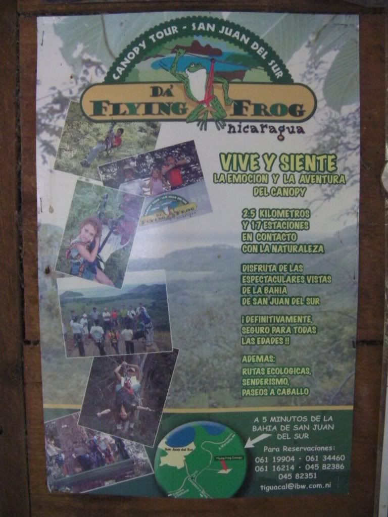 When guests at Morgan’s Rock want to have the experience of zooming over the tops of trees, they normally can’t make it all the way to Café Las Flores’ Mombo Canopy Tour at Mombacho Volcano, which is over an hour away. Instead guests almost always go to Da’ Flying Frog, a canopy tour just 25 minutes away in the hills overlooking San Juan del Sur. At a cattle ranch with a nice amount (acreage unknown) of uncut forest on the property, this series of 17 zip lines includes several practice platforms that prepare you for greater heights by starting over dirt paths. Their longest zip line is 400 meters long, a distance that is fun and exhilarating to complete.