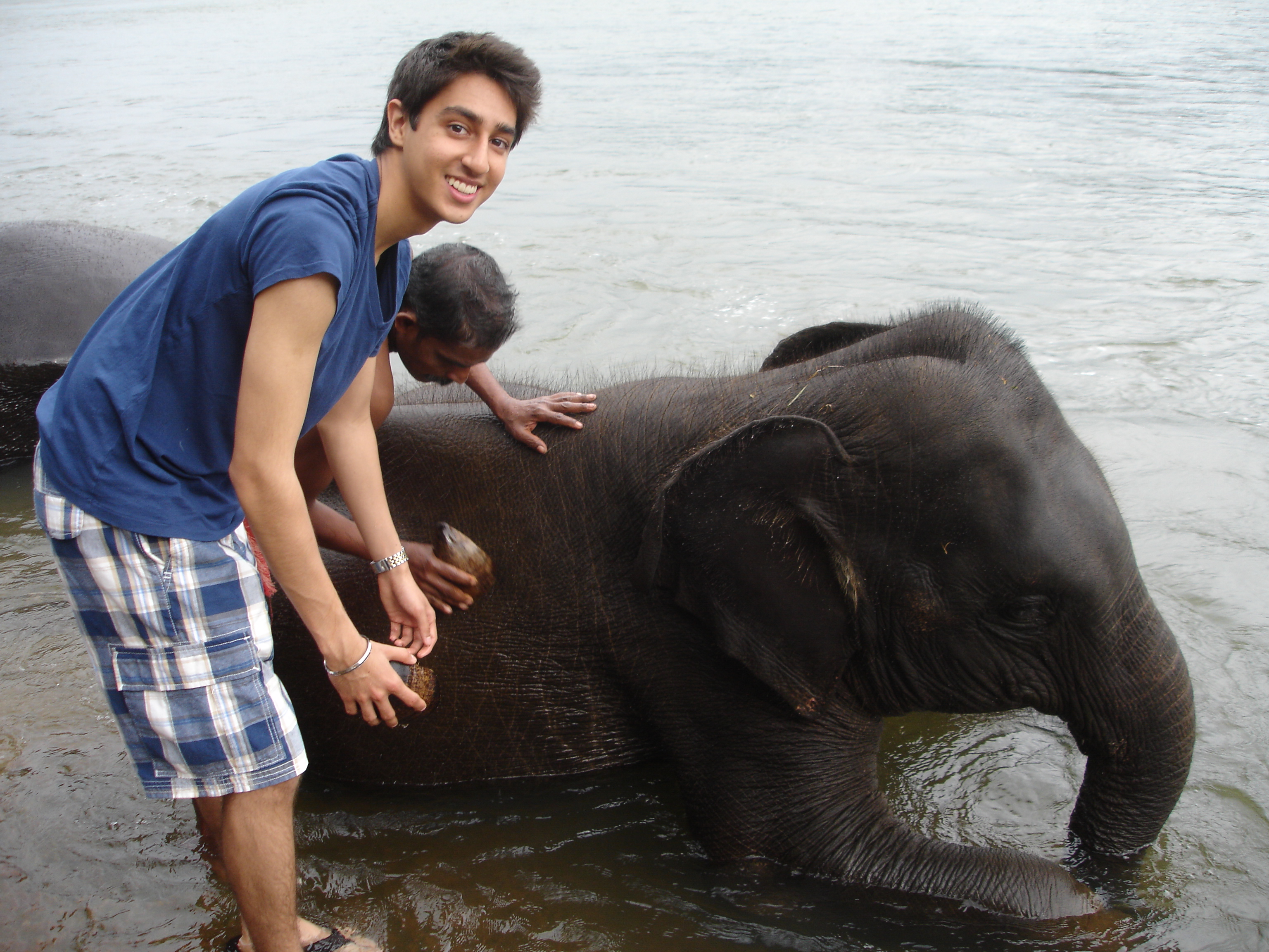 The elephants themselves stride majestically into the water. Then, upon instructions from their mahouts, they ever so awkwardly lay down on their sides, some more readily than others. Most of us have never been so close to an elephant, let alone bathed them. Their grayish, brownish skin is thick and wrinkled, sprouting wiry long hairs at their heads. The hairs on their tails fan out in all directions, as tough as a grill brush, and if you happen to be by their heads (or near the head of a neighboring elephant) expect to be playfully teased by a curious trunk.