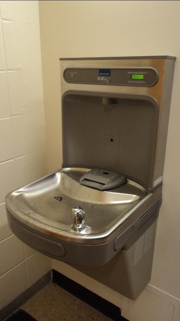 As your bottle fills, a little meter in the top corner of the panel tallies how many plastic bottles have been saved by using reusable bottles. Also, the bottle filling station has a WaterSentry filter (and a light in the top right corner that shows when it needs to be replaced). So far, I have only seen these in Cornell’s Olin Library, both in the stacks and the basement. Hopefully they will spread to every building at Cornell.