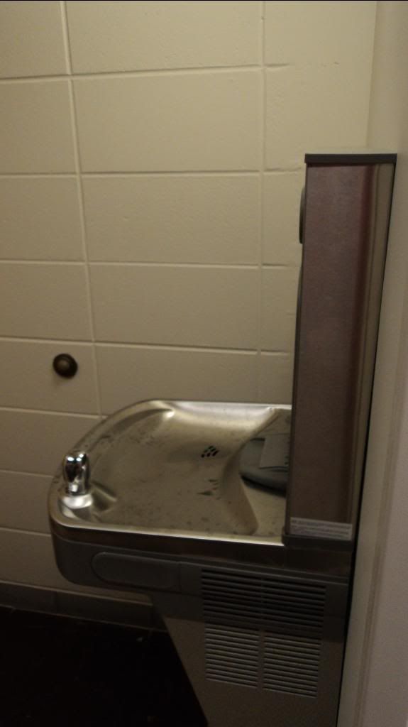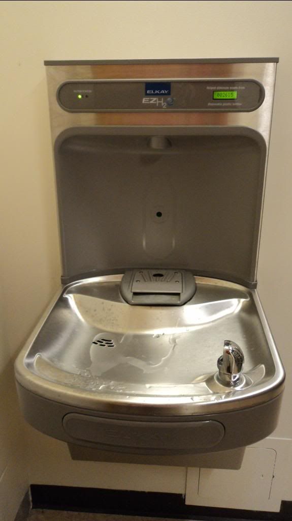 From the side the water fountain looks like most others: a spigot shoots arcs of water from a corner when you press a button somewhere. But when you face the EZH2O water station — a bottle-filling station — you see that the spigot in the corner is not the only mechanism on the wall.