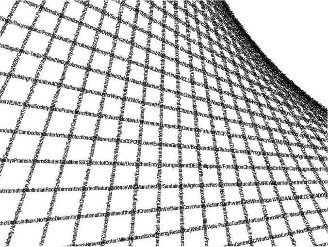 Depicts the names of one million organizations around the world that are devoted to peace, environmental stewardship, social justice, and the preservation of diverse and indigenous culture. The actual number of such organizations is unknown, but estimates range between one and two million, and growing.