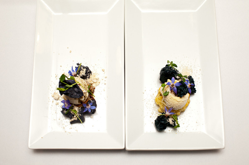 But to us at Studiofeast, we thought it’d be cool to do a meal where an omnivore and a vegetarian could both share the same meal without the former forgoing meat or the latter having to try flesh. That was the seed of an idea that grew into our most recent dinner: a 7 course meal with an omnivore and vegetarian option where each corresponding course looked identical across the meat/vegetable line. And on July 17th, we seated 40 guests–20 omnivores on one side of the table, 20 vegetarians sitting opposite them–and served them our Doppelganger Dinner.