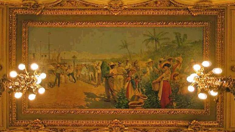 Not to be outdone by Brazil’s Manaus Opera House, the interior is pure Baroque with enough red plush, gold and marble, to satisfy any self-respecting Hapsburg. While the ceiling of the central hall is wildly Celestial, featuring trumpet sounding Seraphim, the lobby ceiling is one of the theatre’s defining features. Painted by Milanese artist Aleardo Villa, it depicts a somewhat romanticized version of the coffee and banana harvest and is so well loved that it once graced the 5 colón bill, constantly serving as a reminder of the theatre’s ties to “Rey del Café”.