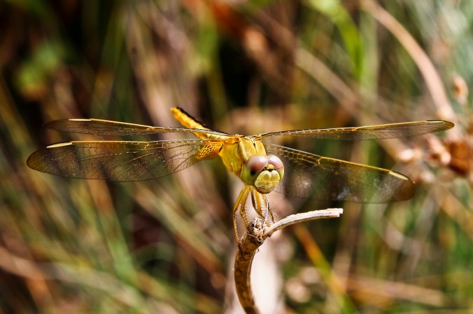 Although it is very possible that there were mature males flying about the area in which I photographed this specimen (there were probably 6 or 7 immature ones about), it would be almost impossible to tell because of the extreme similarity to the mature male Ruddy Marsh Skimmer, Crocothemis servilia. Where there are females of a species, there are males to be found as well, and on the water’s edge there were several female Ruddy Marsh Skimmers, which fortunately are quite easy to identify. Cursory inspection from a decent perspective would have yielded a positive identity – however, as it was mid-day and under a baking hot sun, all the dragonflies present were quite active, and all the red ones (presumably either Scarlet Baskers or Ruddy Marsh Skimmers) refused to land. However, I did manage to catch a decent picture of a female specimen of Crocothemis servilia.