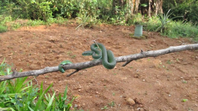 As part of my NGO (Non-governmental organization) we used to participate in several types of forest census. During my last Elephant census on March 12th in the early morning we were all gearing up for the censes walk. Suddenly we heard the screaming sound of our Forest Watcher. Startled, we hurried uphill towards the scream. We found this venomous Large Scaled Green Pit Viper near Velimala (eastern region of Periyar Tiger Reserve). It was my first experience of such a close sighting.