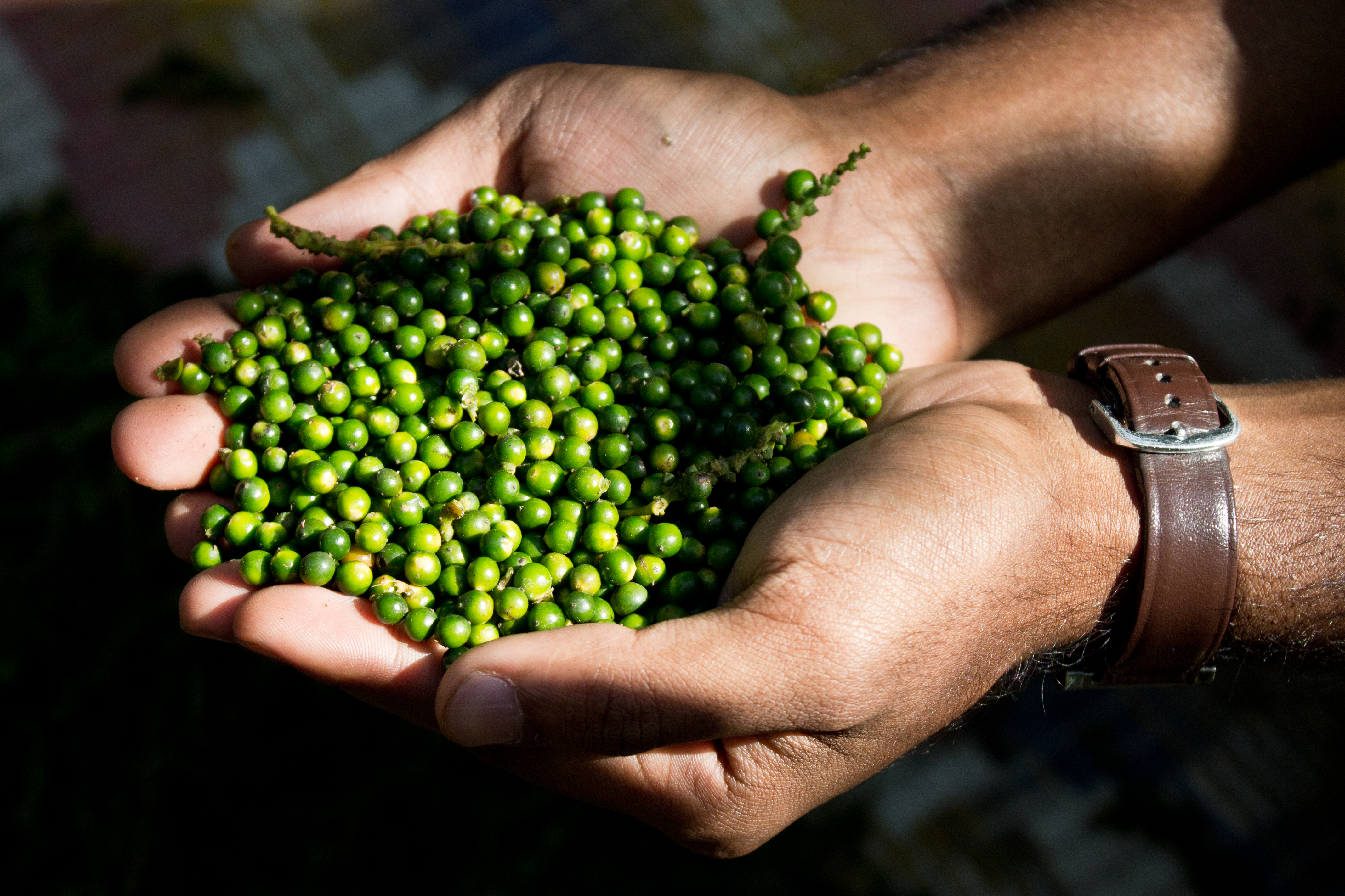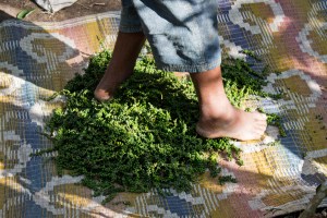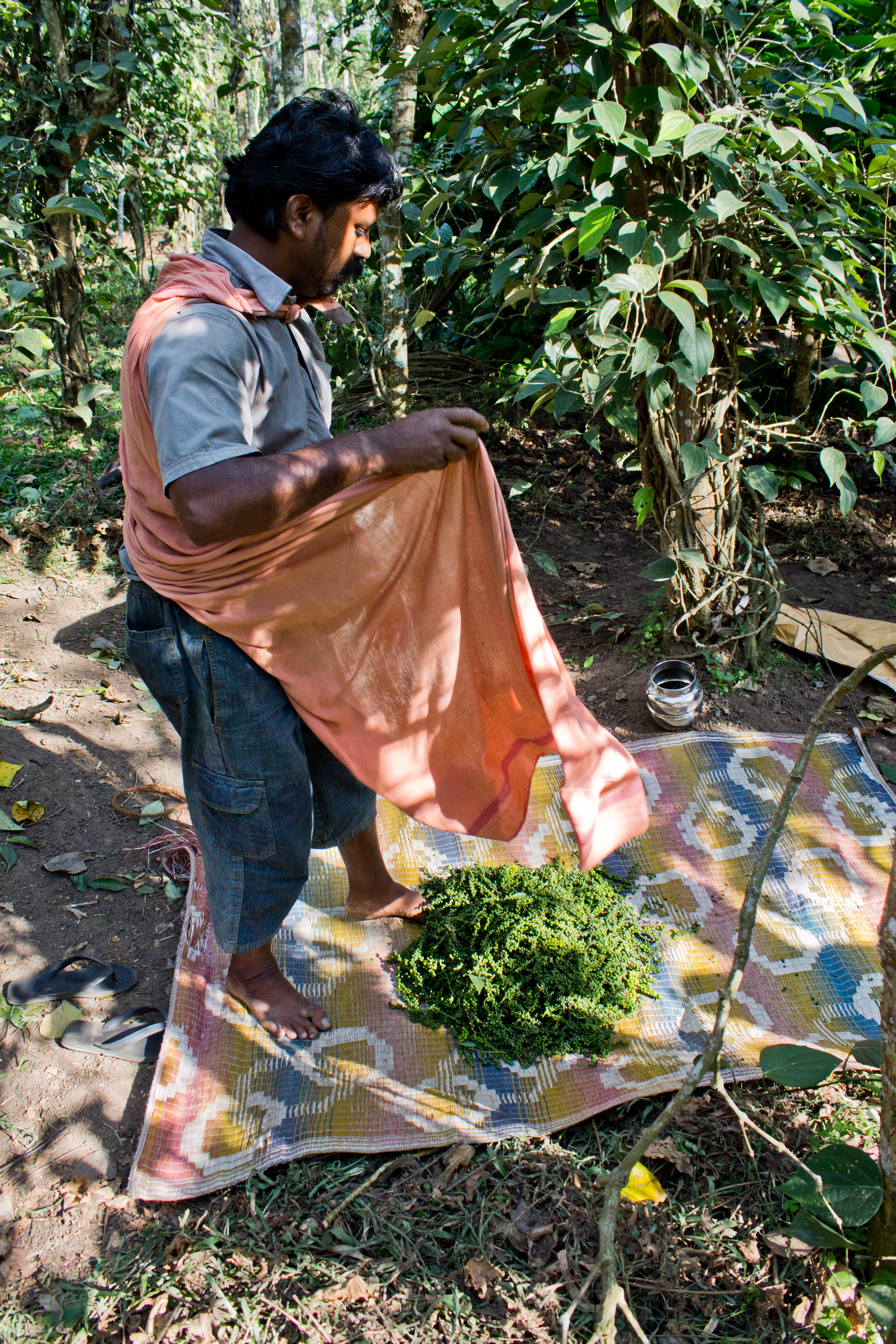 When their cloth bags are full they pour out the pepper laden stems onto a waiting mat on the forest floor. A simple side stepping motion of the feet pulls the berries off the stem, making for easy separation before the next step in processing.