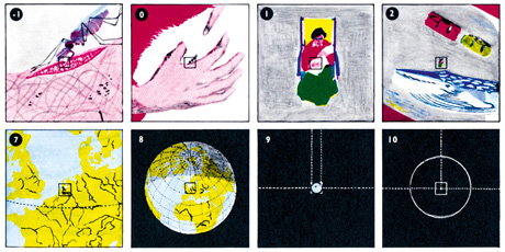 Is it about vertical perspective? The images below are from the book version of Powers of Ten, by Philip and Phylis Morrison and the Office of Charles and Ray Eames, published in 1982 about which Dorrian says: