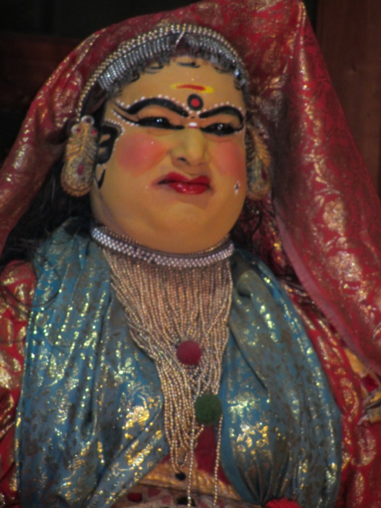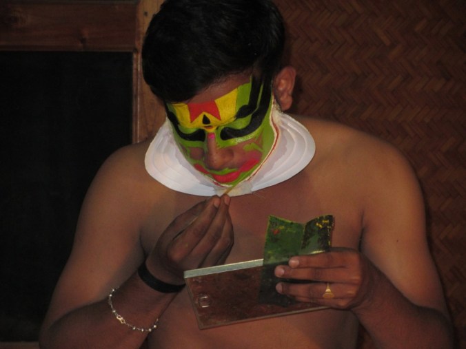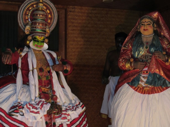 Kathakali literally means story-play. It is a unique art of dance, music, action, literature and even painting. The characters take on superhuman qualities, displaying the moral values of God and Man, similarly to Theyam.