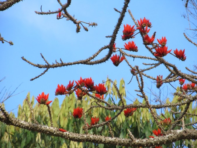 This is the blooming season for the Indian Coral Tree which is a thorny, deciduous, ornamental tree that grows up to 60 to 80 ft tall. This tree is one native to the Western Ghats.
