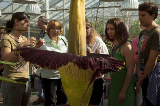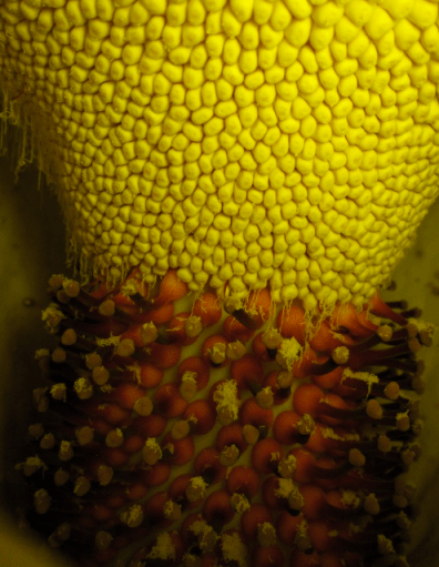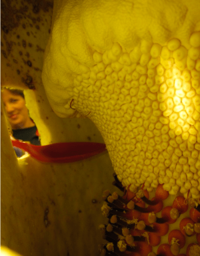 Most plants in cultivation require human pollination in order to remain genetically viable. The Titan Arum is no acception. In fact, this plant actually can’t self pollinate because the 450 female flowers that ring the base of the column-like structure (spadix) are receptive days before the the 500 to 1,000 male flowers above them are ready to shed their pollen. (Even in botany females mature earlier than males!)