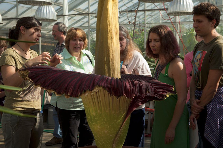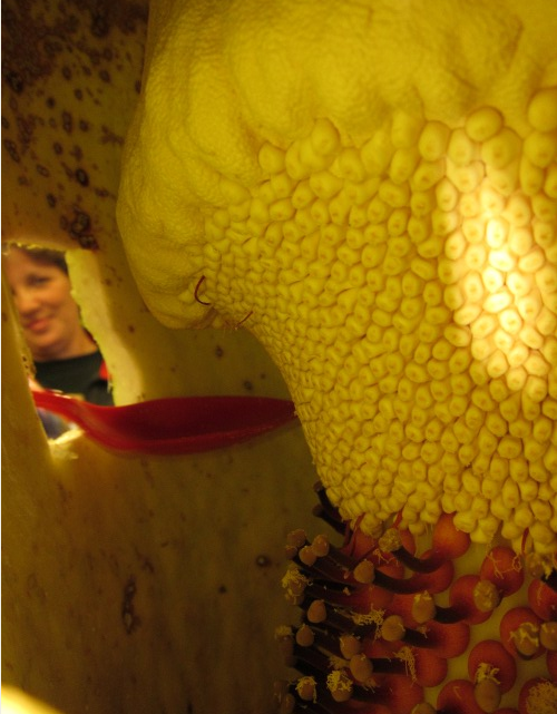 Most plants in cultivation require human pollination in order to remain genetically viable. The Titan Arum is no acception. In fact, this plant actually can’t self pollinate because the 450 female flowers that ring the base of the column-like structure (spadix) are receptive days before the the 500 to 1,000 male flowers above them are ready to shed their pollen. (Even in botany females mature earlier than males!)