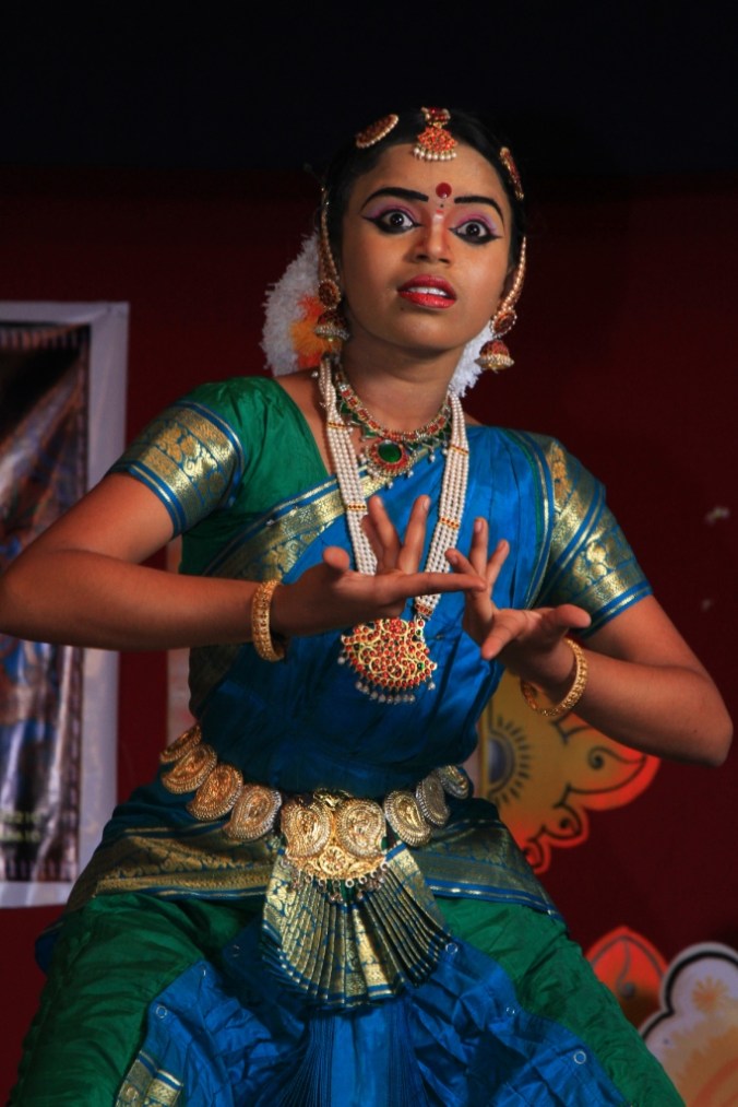 Initially the dancer offers Namaskaram (Salutation) to the God, the Guru (Teacher) and to the audience. This represents both a blessing and welcoming. The dancer will change her facial expression and body language according to the sequence and moods of the drama.