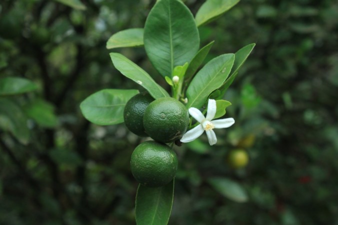 The flowers are white and fragrant, growing in a cluster at the tip of the branches. As the flowers wither, the stigma remains which grows into the orange fruit. The fruit is commonly peeled and eaten fresh and often squeezed for its juice.