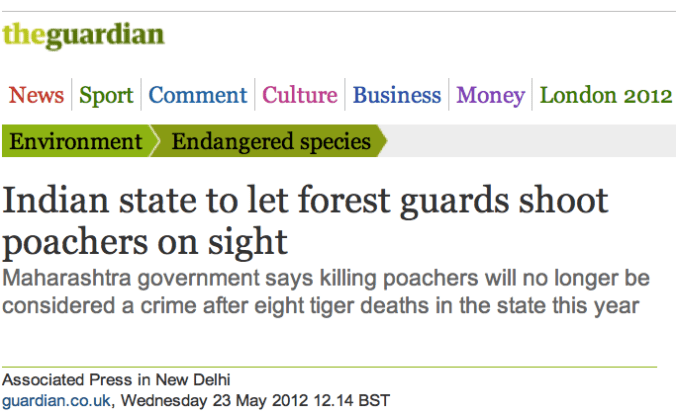 A western Indian state has declared war on animal poaching, allowing forest guards to shoot hunters on sight to curb attacks on tigers, elephants and other wildlife.