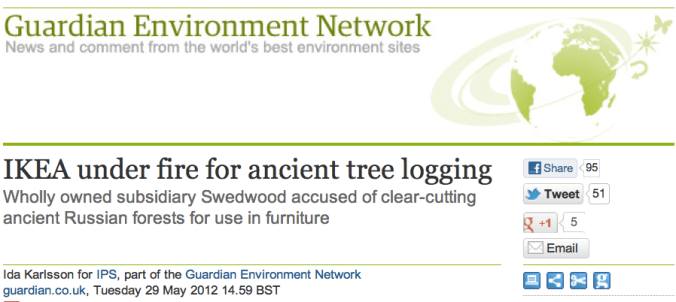 We have mentioned on more than one occasion when an otherwise admired company does something worthy of outrage. Our site is not dedicated to outrage, but when it is called for, we encourage it. Click the banner above to go to the story in The Guardian; following the quote below, click the image after the jump to go to the original, incriminating evidence about the ecological crime Ikea is accused of committing through one of its subsidiaries: