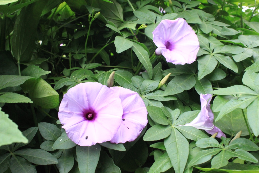 Railway Glory is a tropical, perennial climbing vine with tuberous roots, spreading extensively in the hills of India’s Western Ghats up to 1000m. The plant blooms throughout the year, growing aggressively over fences, shrubs and trees. The attractive flowers are purple, pink or rarely pinkish white. In Kerala it is commonly planted in gardens and around houses for insulation against the summer heat. It is also known by the names Cairo Morning Glory and Coastal Morning Glory.