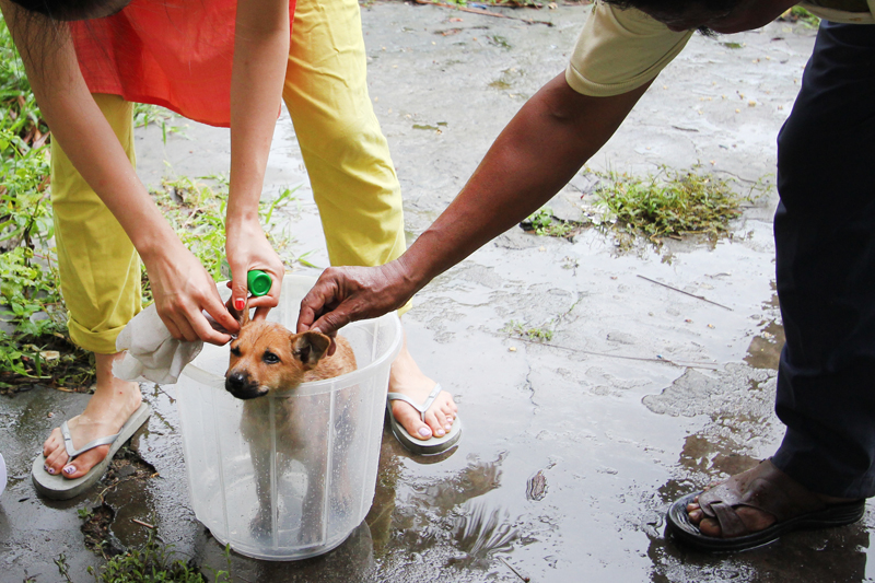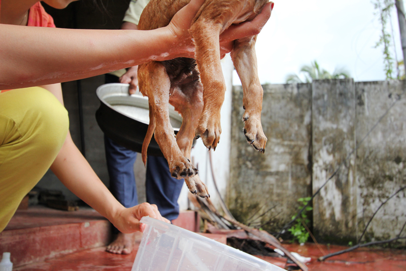 Giving Kais a warm bath. The rest of us had cold showers while “camping” in an abandoned mansion on site!