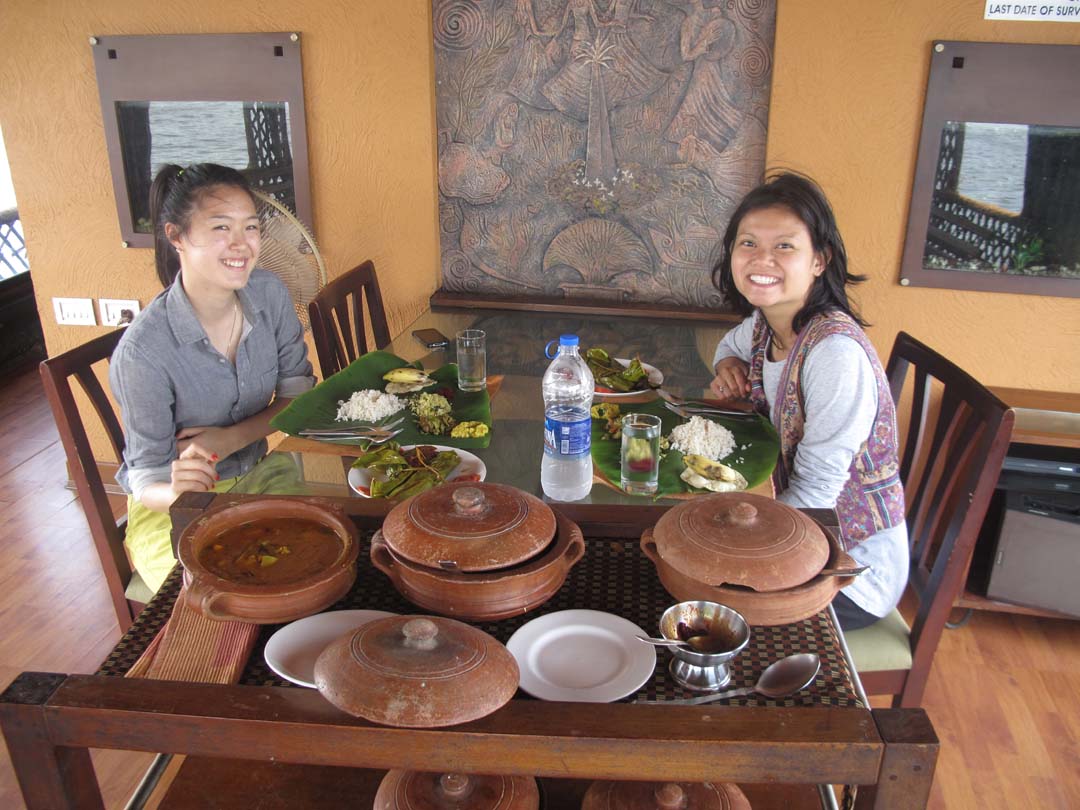 We are on a River Escapes Houseboat having a Kerala meal on a banana leaf. Karen Chi-Chi Lin (left) and Rania Mirabueno (right).