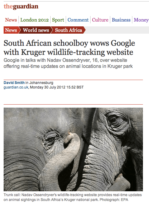However, A 16-year-old schoolboy has found a hi-tech solution. Nadav Ossendryver’s website, Kruger Sightings, provides real-time updates on wildlife sightings in South Africa‘s world famous Kruger national park.