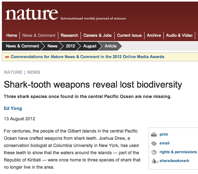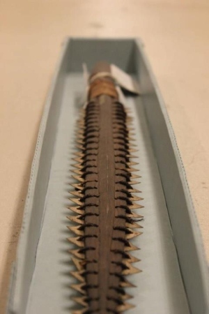 Weapons from the Gilbert Islands contain the teeth of shark species no longer found in the area. Photo by J. DREW/COLUMBIA UNIV.