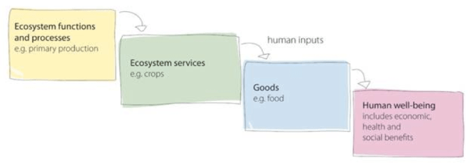 ), and opportunities for cultural, spiritual and recreational experiences. Some ecosystem services result in ‘goods’ (see Figure), such as crops, which are market-based and so are easy to measure and value. However, others are non-market based, such as benefits to physical and mental health (
