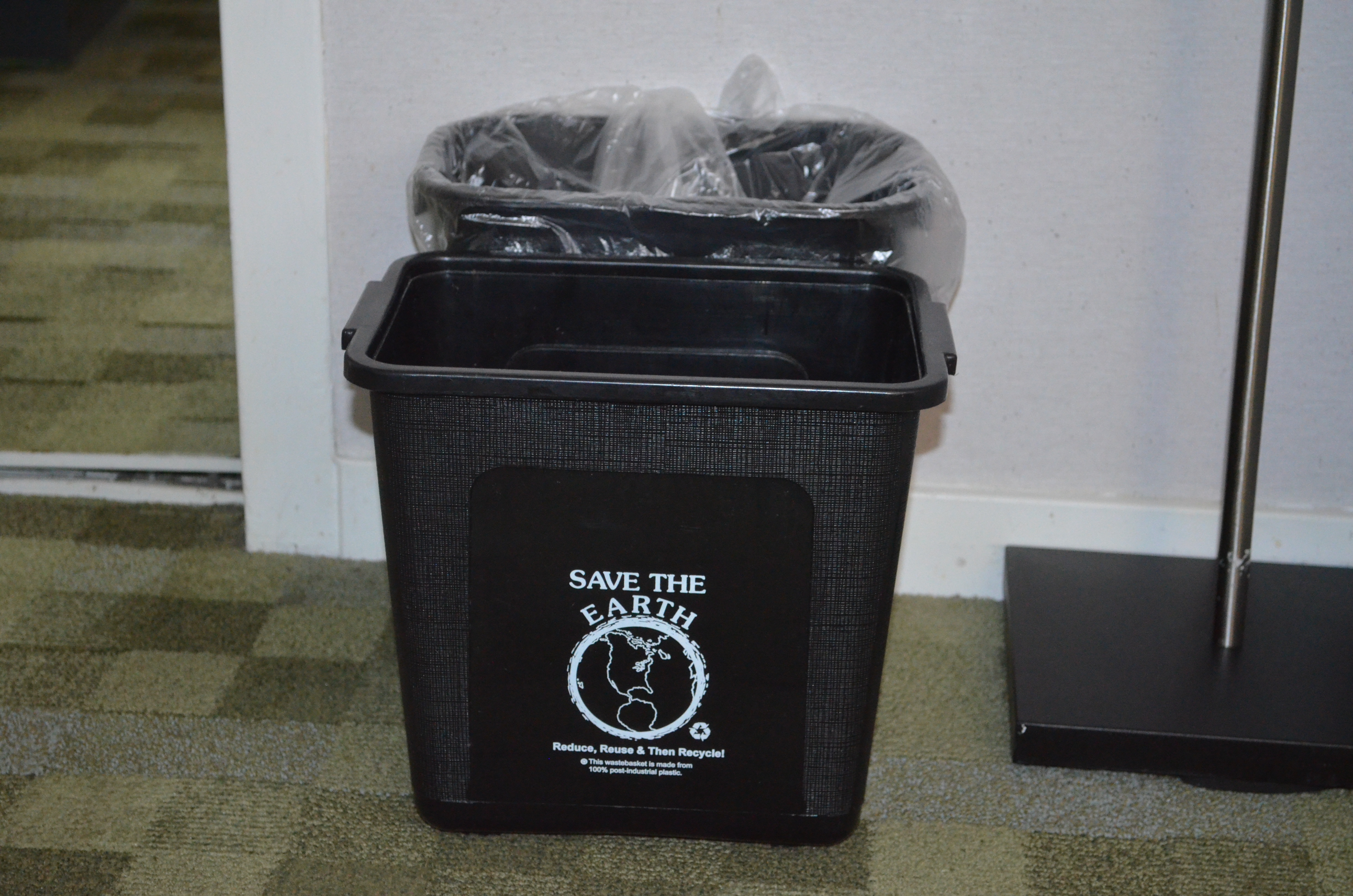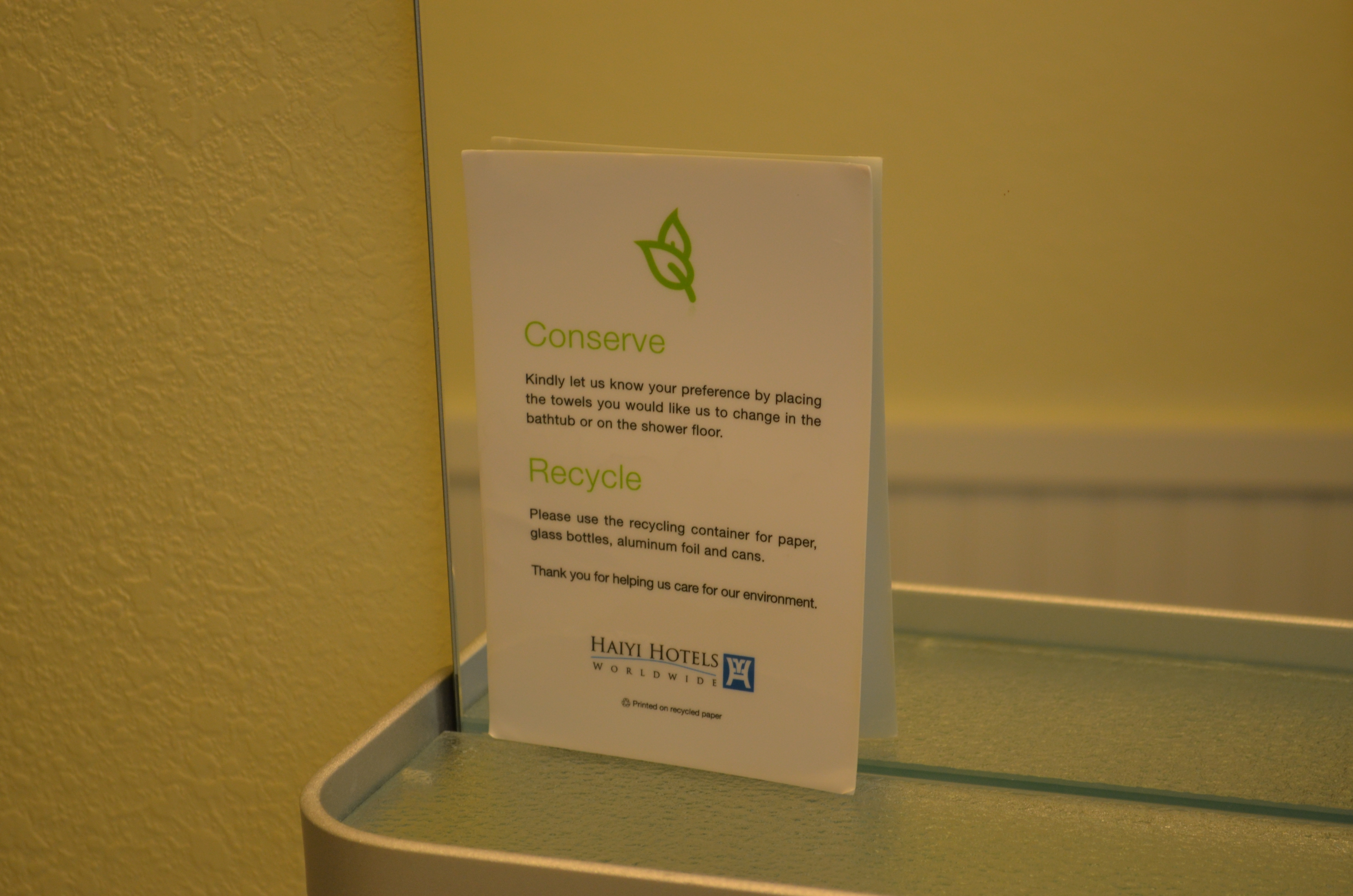 In the room, you could see what efforts were made toward resource savings. There was the typical towel and linen program, granting the guest a choice regarding the frequency with which their linens are changed and washed. There were recycle bins prominently placed with conspicuous messages of environmental awareness. And in the bathroom, the shower amenities were available in bulk dispensers that nullify the need for all that extra plastic and packaging.
