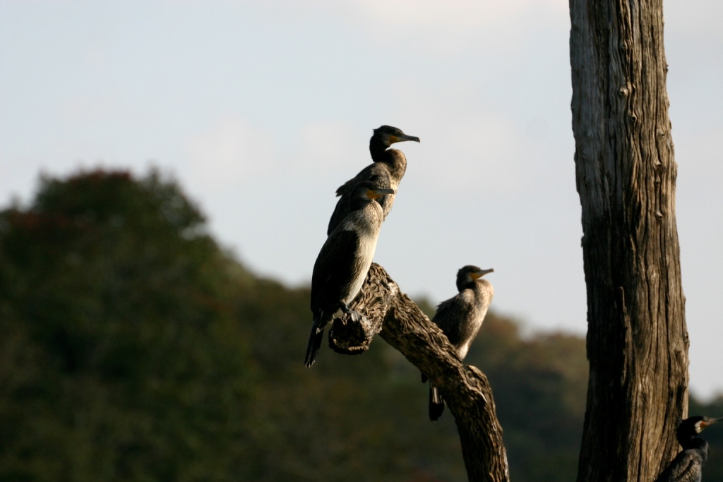 The submerged tree trunks in the 26sq km Periyar Lake nestled inside the forest create a favorite habitat for a number of aquatic birds, especially Large cormorants.