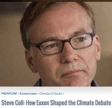Okay, we admit that Exxon fails the Really? test. Little about them shocks us at this point. We have highlighted examples of passing that test with flying colors, looking no further than our living room and even in our favored reading materials. But thanks to one of the best investigative journalists out there, a writer at The New Yorker and author of Private Empire: ExxonMobil and American Power, we find we still have a bit of shockability. Steve Coll, interviewed for a Front Line series on Climate Change (caveat emptor: that documentary film series is exhaustively full of Really? revelations; for a smaller dose, click the image above for the transcript of the Coll interview, or here for a podcast of an interview he gave about the book on Fresh Air):