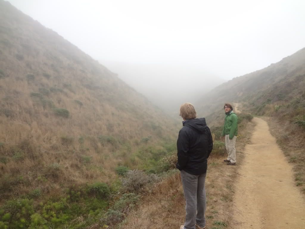 In the afternoon we were off, driving up the west coast without any real plans; we knew we wanted to be in Seattle in four or five days, but that intervening time period was ours to spend as we wished. From a quick glance at the map, we thought that Point Reyes, a national coastline a few hours north of the bay area,would be a good place to set up camp for the night. We took the west fork of the highway as we neared the Point and drove most of its northern length; a thick fog, however, not uncommon where the warm air from the East meets the colder air of the Pacific coast, blanketed everything so that we saw little of the coastline or surrounding environs from the car. There were a surprising number of hilly, historic ranches we could make out along the road, though. Eventually we came to a parking lot with a few trail-heads. A bit further along, the road basically ran out. We were all a bit queasy from the ups and downs of the drive, so despite the pea-soup fog and the cold, drizzly atmosphere, we decided to stop and see if we could find a way to hike to the beach for a look at the Pacific ocean. Moreover, we reckoned that it wouldn’t be bad to scout out possible beach campsites.