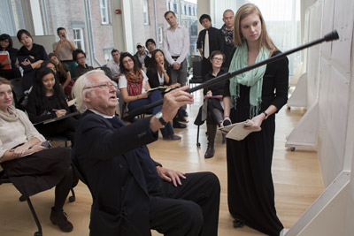 Architect Richard Meier ’56, B.Arch. ’57, visits an architecture studio class Oct. 17 in Milstein Hall, where as an assignment students had prepared drawings interpreting Meier’s designs. Photo credit: Robert Barker/University Photography