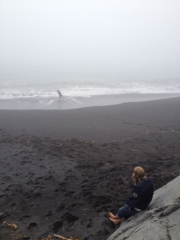 We eventually came to a grouping of massive rocks jutting from the beach. A few pieces of burned wood scattered about led us to believe that this had been a common campsite. Indeed, the rocks provided shelter from the sea spray, a felled log for sitting, and ideal perches on the crags for reading, talking, and admiring the surroundings. We decided to settle here for the night, and unpacked our belongings and pitched our tent. We spent the rest of the evening exploring the area and gathering firewood as the fog grew denser. We never really knew exactly when the sun set, because long before it was dark the world beyond our campsite was rendered opaque by the thickening mists. A few hikers passed through our camp at one point, returning from the flats further down the beach, but otherwise we had no visitors. Carl and Nick tried their hand at fishing, but discovered that the rod we’d brought was missing its handle. They attempted to simply throw a weighted hook on a fishing line into the surf, but it was invariably tossed back in midflight towards the shore because of the strong wind. Soon we had lost all of our line, so they were forced to give up the endeavor.