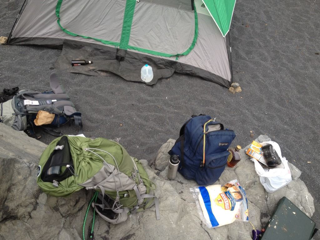 After practicing hatchet-throwing skills and tossing around a boomerang for a few minutes, we deemed it safe to continue the journey, especially because we had reason to believe we were close to the beach trailhead. A few more minutes, indeed, saw us in the trail’s parking lot. We popped the trunks, emptied our bags of clothes, and began to pack for the hike in. We didn’t have the recommended bear canister, so instead we packed a few lengths of rope away to hoist our food. Soon, we were on Black Sands beach; we had packed a pretty decadent dinner, and were lugging along a stove and giant tent, so we didn’t want to hike too far down the coast. (We weren’t exactly planning on roughing it!) There was a seven-mile stretch before we reached any real campground, so we planned instead just to find a nice spot on the beach somewhere in that length and set up camp.