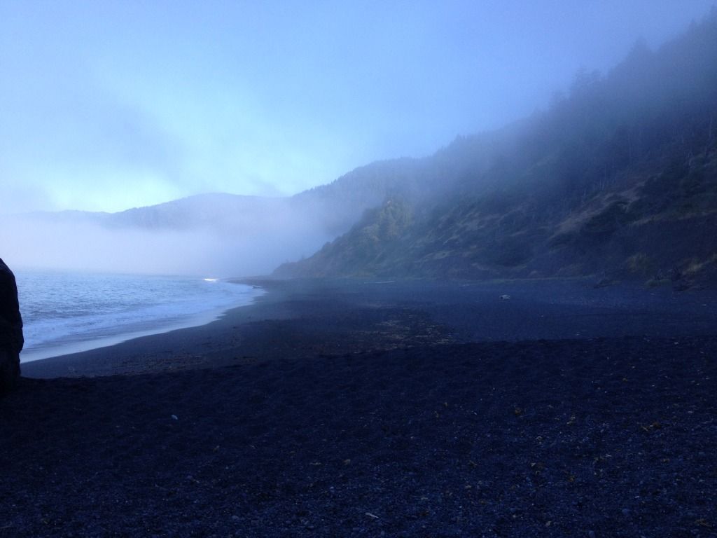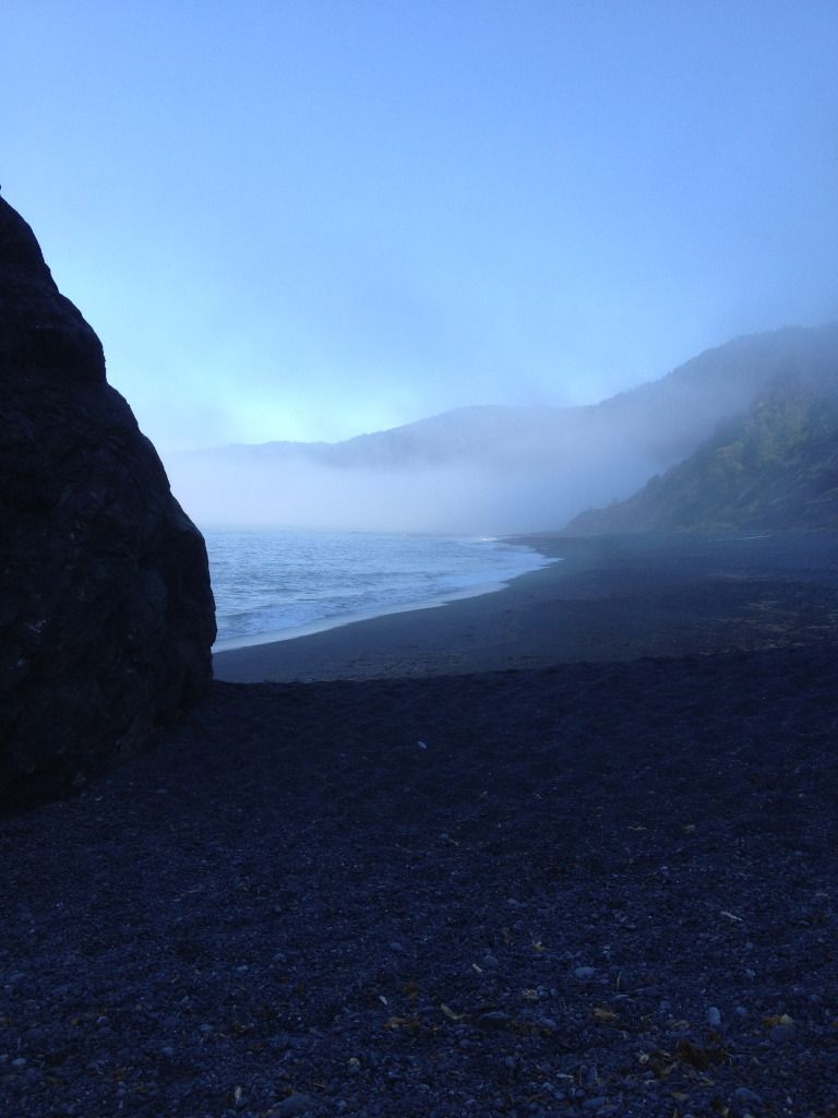 The walk was difficult, but incredible. The sand under feet gave way at every step, so each step felt like two or three on firm ground. And as with so many stretches of the Pacific Coast, a pall of thick gray cloud hung low over us, straining the sun’s feeble rays of light through its cottony mass. We were enveloped in a muted solitude, even a wildness: any sound beyond the ocean’s heaving swells struggled to pierce the damp air, and the steep peaks on our right hand, beginning just where the beach ended, were lost in the gauzy mist. Although we weren’t that far from our car, the heavy atmosphere seemed to put a world between the lined tarmac and us. We were beginning to understand another sense (intentional or not) to the name “Lost” Coast. This effect only increased as the evening progressed; long before nightfall, our visibility had already dropped to a dozen or so meters. But for now, there was still enough light, even through the cloud layer, for us to marvel at the billions of tiny pebbles strewn along the beach. Where the ocean’s waves pounded the coast, the black sand was incredibly fine. But with each step away from the water, the pebbles increased in size—never, however, deviating from their perfectly smooth, spheroid shape. Gradually, they grew to the size of peas, then marbles, then a clenched fist. Among these were scattered rocky globes the size of our heads, presumably the much-diminished fathers of all of the grains spread about them. (Chips off the old block, right?)