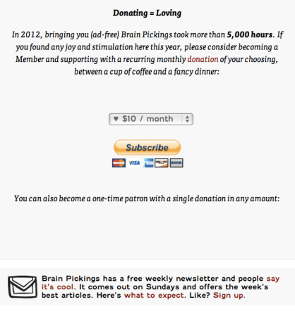 Her exhaustively assembled grab bag of scientific curiosities, forgotten photographs, snippets of old love letters and mash notes to creativity — imagine the high-mindedness of a TED talk mixed with the pop sensibility of P. T. Barnum — spans a blog (500,000 visitors a month), a newsletter (150,000 subscribers) and a Twitter feed (263,000 followers). Her output, which she calls a “human-powered discovery engine for interestingness,” has attracted an eclectic group of devotees including the novelist William Gibson, the singer Josh Groban, the comedian Drew Carey, the neuroscientist David Eagleman, the actress Mia Farrow and the Twitter founders Biz Stone and Evan Williams.