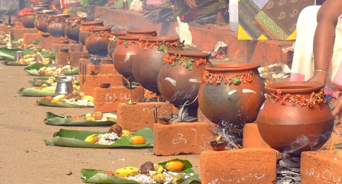 This festival takes place in Sree Bhagavathy Temple near Alleppey during the month of Vrischikam (November/December) in Kerala’s lunar-based calendar; the time when the glory of the Goddess is at its peak. This is one of the state’s most renowned festivals, where tens of thousands of female devotees gather around the temple days before the function. The women line up on both sides of the main streets and each arranges an area for offering the Pongala (cooking demo) in front of them. Each one brings an earthen cooking pot with rice, coconut and jaggery.