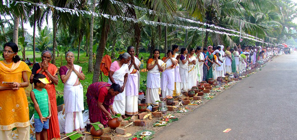 This festival takes place in Sree Bhagavathy Temple near Alleppey during the month of Vrischikam (November/December) in Kerala’s lunar-based calendar; the time when the glory of the Goddess is at its peak. This is one of the state’s most renowned festivals, where tens of thousands of female devotees gather around the temple days before the function. The women line up on both sides of the main streets and each arranges an area for offering the Pongala (cooking demo) in front of them. Each one brings an earthen cooking pot with rice, coconut and jaggery.