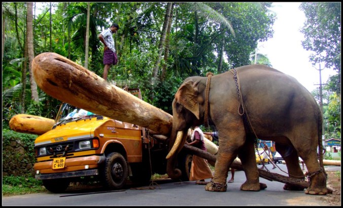 Kerala has about 700 domesticated elephants. Of these 90 percent are tuskers (the local term for male elephants), who play a major role in religious festivals. Apart from their role in temple ritual, the elephant’s strength and power has been effectively harnessed in work in the logging industry, primarily in loading timber for transport. This is unique to this region.