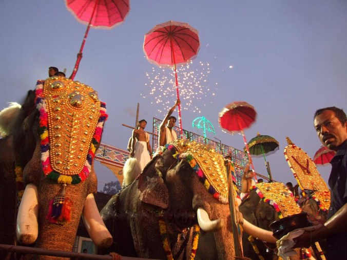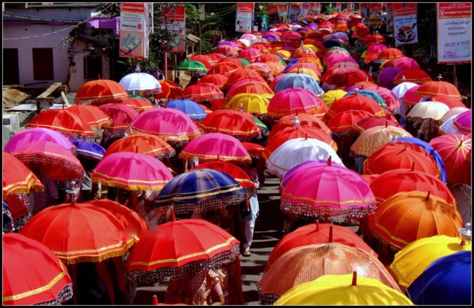 Mutthukkudas are one of the main attraction in Kerala’s religious and political ceremonies, especially at the Thrissur Pooram, the state’s primary festival. During the pooram festival time there is one attraction called kudamattom (exchanging umbrellas) which is the most important aspect of the Trissur Pooram, were hundreds of beautiful long stemmed glittering umbrellas are exchanged rhythmically along with a traditional music orchestra and chenda melam played in the back ground.