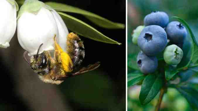 Wild bees, such as this Andrena bee visiting highbush blueberry flowers, play a key role in boosting crop yields. Left photo by Rufus Isaac/AAAS; Right photo courtesy of Daniel M.N. Turner