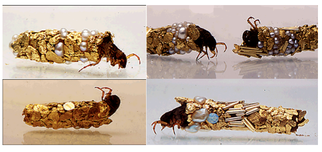 French artist and science enthusiast Hubert Duprat took his natural curiosity to an elaborate level when he began providing these case building larva with gold spangles and semi-precious materials in lieu of the bits of sand and gravel they would normally use.