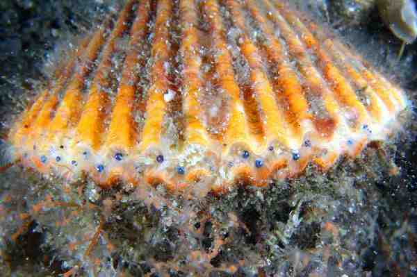 Unless you are an avid scuba diver, when you think of scallops, you probably think of linguine and garlic more than oceans and shells. That’s because we only eat the muscle of the scallop: You never see them in context.And so … one of the most shocking things I discovered researching animal vision was that scallops have eyes! Not only do they have eyes, they have dozens of them along the edges of their shell openings. And the weirdest part? In some species like the bay scallop, the eyes are the prettiest blue color.Gah! Try and saute up some scallops tonight after seeing that photograph. I dare you.These eyes are not exactly competing with eagle eyes for visual acuity. But they do have some very strange and interesting features, as Sonke Johnsen explains in his surprisingly readable and fun book, The Optics of Life: A Biologist’s Guide to Light in Nature. Each of these eyes has a tapeta, which is a biological mirror that sits on the back of the retina. In most nocturnal species, the tapetum (singular form) bounces light back through retina, allowing the photoreceptors in animals like cats and raccoons a second shot at capturing more light, which is key for seeing in very dim conditions.