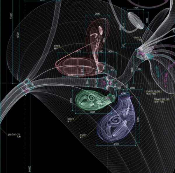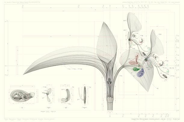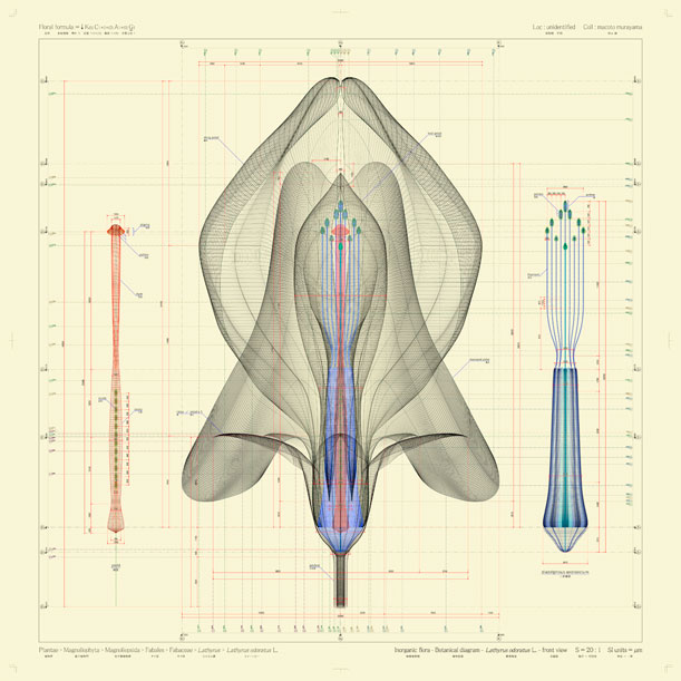 Using his background in computer graphics and illustration, media artist Makoto Murayama creates technical, scientific blueprints of flowers that look like they belong in a manual for semiconductors. In fact, his work has just been selected as part of thesolaé art gallery project, an initiative to bring art into the offices of Tokyo Electron, one of Japan’s largest semiconductor companies.