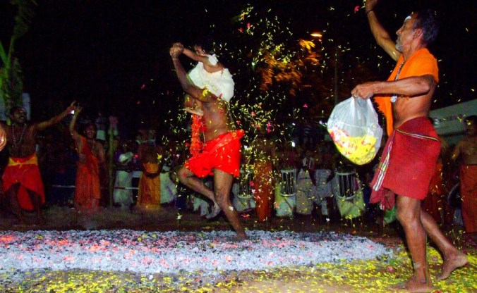 Kerala is rich in beliefs and the Fire Walk is one of the most difficult example. The person doing the fire walk must follow specific religious practices. The devotee walks through a pit of burning coals and the surrounding devotees sing hymns praising the lord. The sound of the drums and the burning of the incense make the entire atmosphere inspiring. The devotee gets in to a state ecstasy and easily walks over the fire.