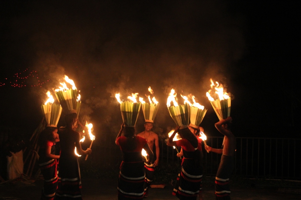 The above dance belongs to the Paliyan people, a local community in Thekkady. This dance is usually performed during the first harvest of the season. The ceremonial dress for this dance includes either a cap created from the palm leaf sieve used to separate the wheat from the chaff, or more extravagantly, a crown of long crop leaves with a torch in the center.