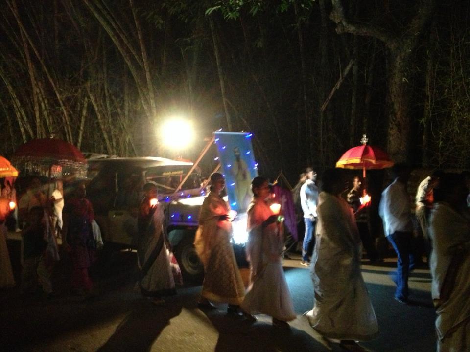 So when a procession passed right in front of the bright lights, the heat of the night and the loud music contrasted with the fervor and the peacefulness of the walkers. After the procession finally arrived at the Church I felt privileged to having witness this moment.