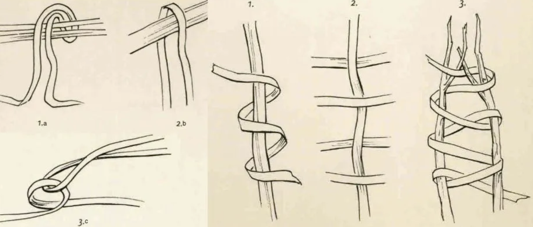 1a. Loop tuck, 2b. Simple loop. 3c. Interlocking loop, 1. Spiral coil, 2. Simple weave, 3. Alternately reversed winding. In Avian Architecture by Peter Goodfellow © Princeton University Press 2011. p101